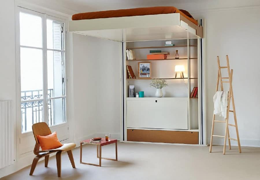 Cuando la cama es levantada, el cuarto puede servir para pequeños encuentros, recepciones, como cuarto de entrevistas o como cuarto de venta. Cuando la cama está baja, el cuarto se vuelve una habitación para dormir con una cama confortable.